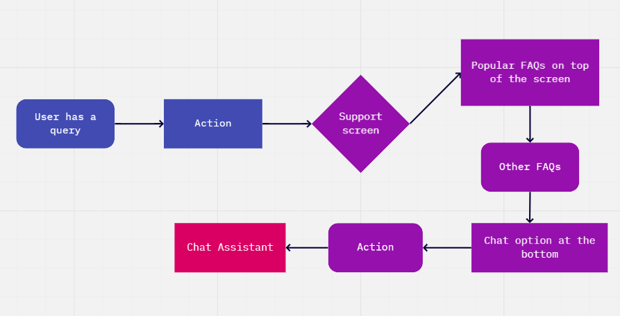 Since there was no 24*7 support system in the current phase, so I designed FAQ section along with chat option, so that the users can first check if their query is first being answered in FAQs or not. For this I first designed the user flow and then designed screens accordingly so that the support gets less queries. Following is the user flow chart of how the user can navigate through app for their queries: